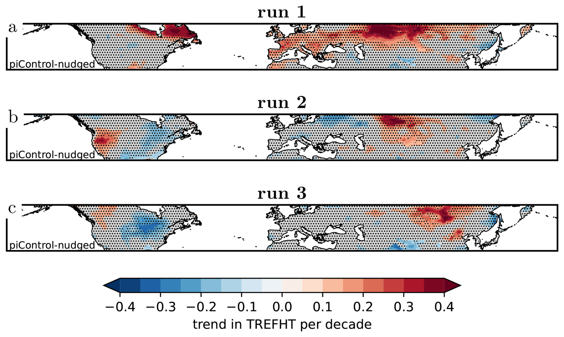 Over the period 1979–2023, JJA temperature trends in the piControl-nudged simulations range from −0.35 to 0.35 K per decade (Fig. 3a, d and g). These trends are organized in large regional clusters of alternating signs. Furthermore, the trend patterns differ considerably between the three piControl-nudged runs, indicating that in CESM2, circulation-induced trends are dominated by internal variability and that in CESM2, forced circulation changes are minor. Overall, JJA temperature trends are slightly stronger in run 1, which is likely due to the positive GMT trends in the piControl-nudged runs during this period (see Fig. 2).