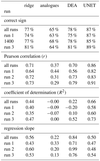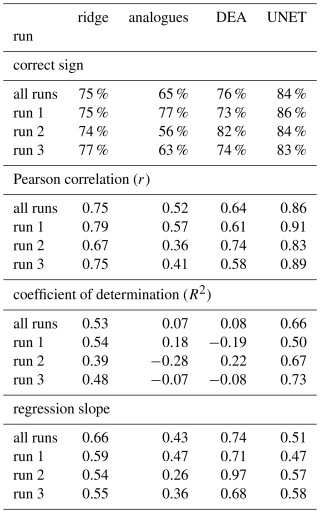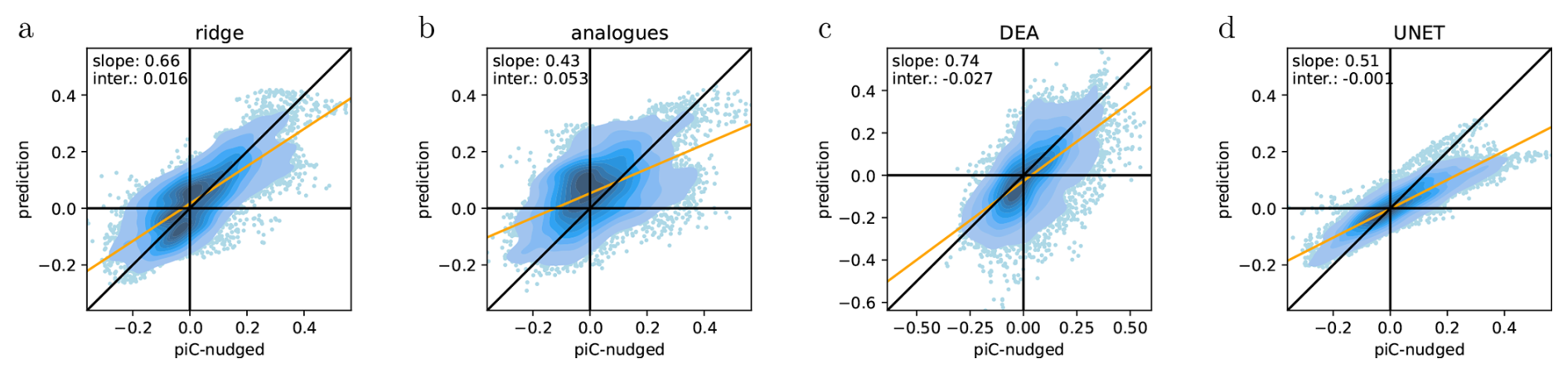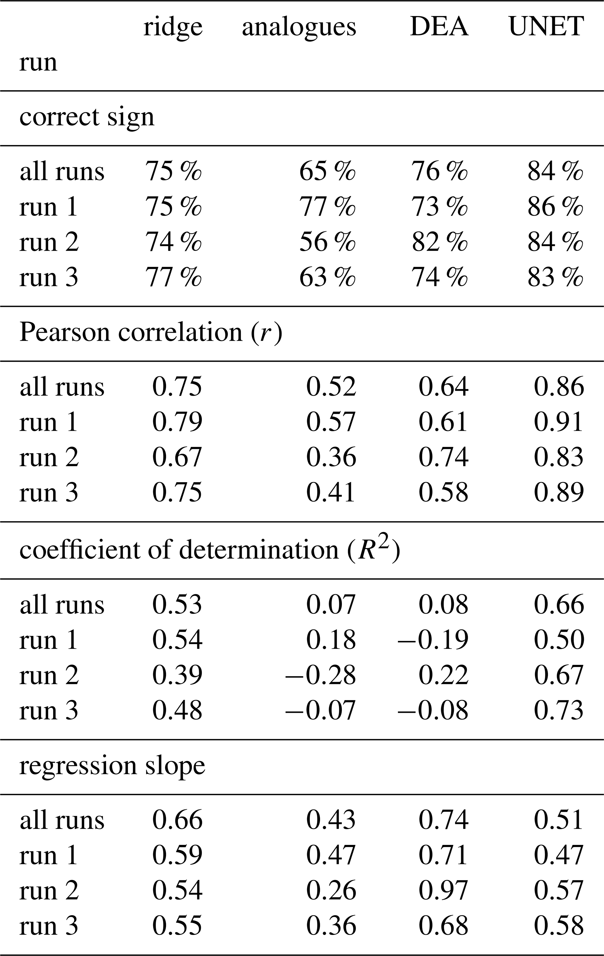 The UNET is performing the best of all tested methods here. With UNET, 84 % of trend signs are predicted correctly; it has the highest Pearson correlation coefficient (0.86) and the highest coefficient of determination (0.66). In comparison to the DEA and ridge regression, UNET tends to predict weaker circulation-induced trends and rarely exceeds magnitudes of 0.2 K per decade. As shown in Fig. C1, this leads to a systematic underestimation of the trend magnitude compared to the piControl-nudged simulation.