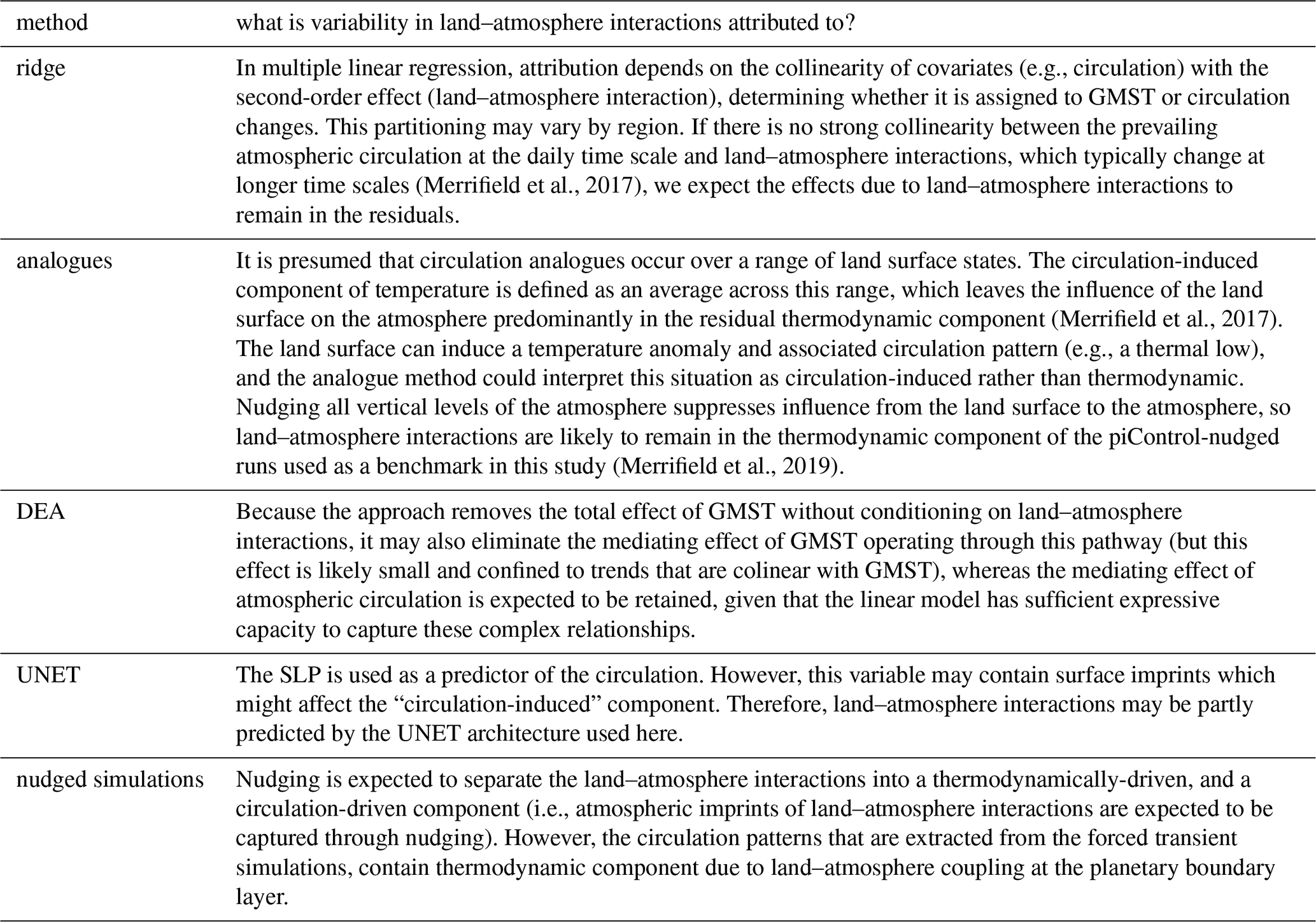 Second, and partly related to the previous point, designing a method comparison for the identification of circulation-induced time series is challenging. This is because it is not immediately apparent what the components are that the signal is decomposed into, and which relevant mechanisms can be attributed to these components. In this study, we decompose a trend in local temperatures into a “circulation-induced” component and a “thermodynamic” component without specifying to which of these components changes in other important factors, such as soil moisture or aerosol concentrations, are attributed (see Fig. 5 for the example of land–atmosphere feedbacks). Therefore, the different methods also estimate different trends for the “thermodynamic” component as shown in Fig. 4. The different statistical methods evaluated here were initially developed for similar but slightly different research questions: The analogue method, for instance, was designed to separate the “thermodynamic signal” from “circulation-induced variability.” Yet, it has been shown that summer land–atmosphere interactions remain largely in the residual, thermodynamic component due to the method's setup (Merrifield et al., 2017). On the other hand, machine learning methods such as the UNETs may implicitly identify land–atmosphere interactions as part of circulation variability, if circulation carries an imprint of land–atmosphere variability. In Table 2 we summarize our thoughts on the treatment of land–atmosphere feedbacks in the different approaches.